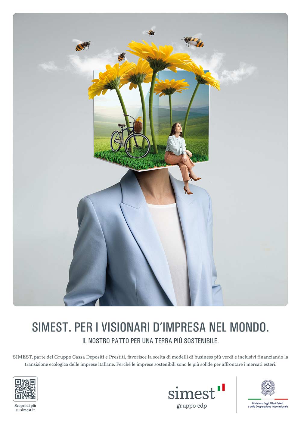 La creatività, dal sapore surrealista, strizza l’occhio alla capacità visionaria degli imprenditori e delle imprenditrici del nostro Paese per comunicare loro l’impegno di Simest a sostegno della crescita estera del Made in Italy, dell’internazionalizzazione delle filiere produttive, della digitalizzazione e della transizione ecologica.