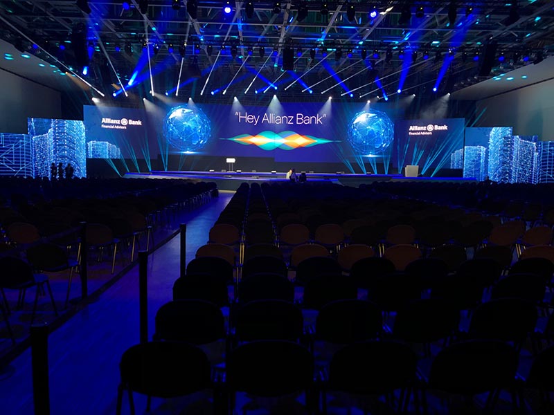 Il concept dell’evento – dal carattere fortemente emozionale, interattivo e, soprattutto, suggestivo, la cui parte creativa è stata interamente curata da Brainwaves ad eccezione della scenografia ideata e realizzata dal comparto creativo di G2 – si è focalizzato sull’amplificare visivamente il dialogo virtuoso tra capitale umano e tecnologia portato avanti da Allianz al fine di assicurare sempre la soddisfazione del cliente del futuro, interconnesso e proiettato verso una dimensione digitale, grazie a servizi tailor made estremamente evoluti. Un’ideale rappresentazione dell’integrazione della strategia digitale e dell’introduzione di strumenti vocali evoluti in cui Allianz Bank sta investendo per essere sempre più vicina ai suoi clienti: non a caso la voce di un’assistente virtuale ha accompagnato l’intera convention, un alleato invisibile ma fortemente rappresentativo del ruolo centrale della tecnologia nella banca del prossimo millennio.
