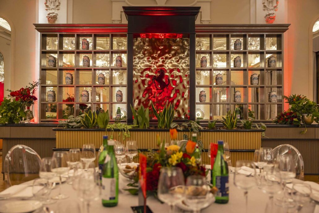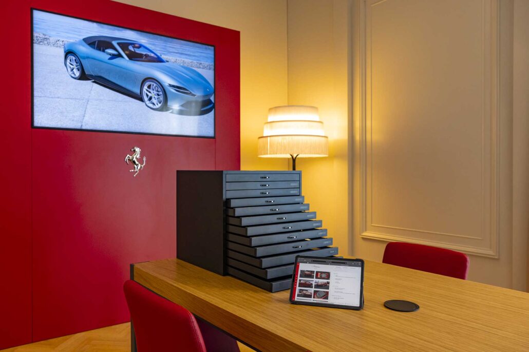 Per l’occasione la location è stata interamente personalizzata dal team di Genius Progetti, che ha realizzato un vero e proprio “Palazzo Ferrari”: tutte le aree comuni sono state brandizzate grazie alla realizzazione di materiali ad hoc, un arredo dedicato e l’inserimento di dettagli di design quali lampade, cuscini e tappeti. Il tutto con l’obiettivo di andare a integrare il brand all’interno della struttura, dove sono stati realizzati anche una temporary pop-up boutique con i capi dell’ultima collezione Ferrari Style; una area dedicata per testare alcune configurazioni create dal Centro Stile di Ferrari con ispirazioni sartoriali e high-tech per la capote e svariate scelte di colori e finiture per esterni e interni; un’area privata per esplorare la vasta gamma di optional disponibili e configurare la propria Ferrari Roma Spider con i rappresentanti delle concessionarie ufficiali.