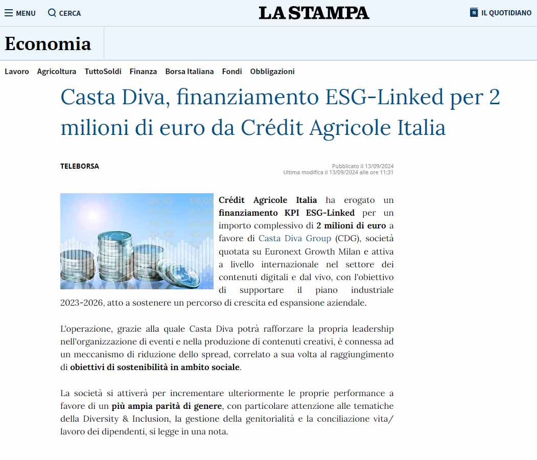 Casta Diva, finanziamento ESG-Linked per 2 milioni di euro da Crédit Agricole Italia