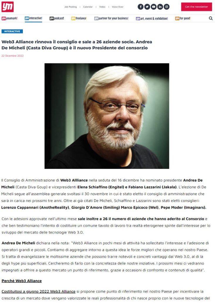 Web3 Alliance rinnova il consiglio e sale a 26 aziende socie. Andrea De Micheli (Casta Diva Group) è il nuovo Presidente del consorzio